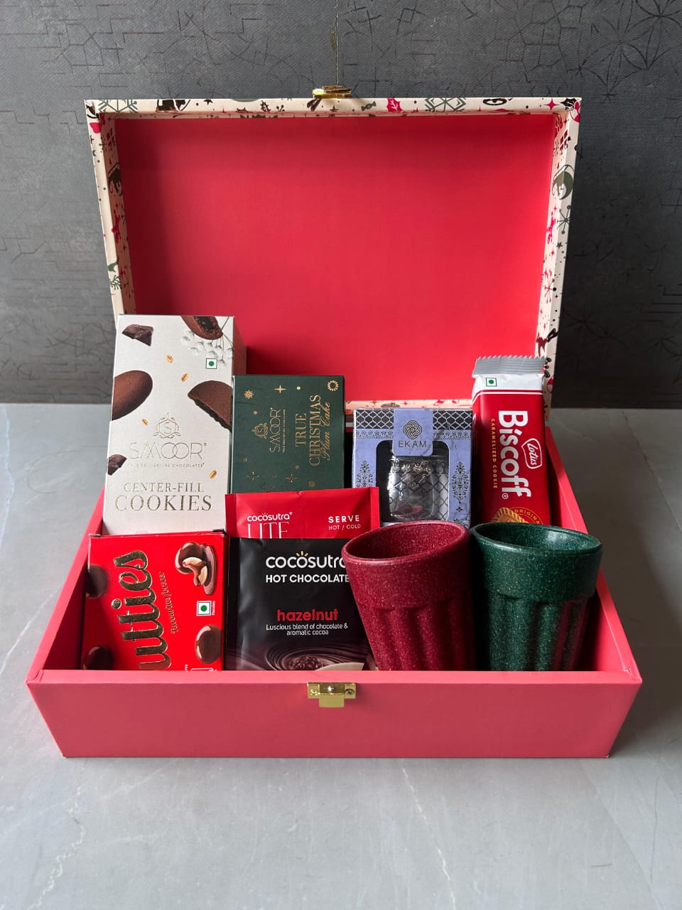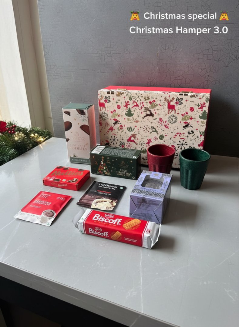 The Christmas Hamper 3.0 includes a fancy trunk box, two eco-friendly tea cups, two hot chocolate sachets, one mahogany scented candle, one Smoor premium cookies pack, one Smoor premium plum cake (vegetarian), and one Lotus Biscoff biscuit pack.