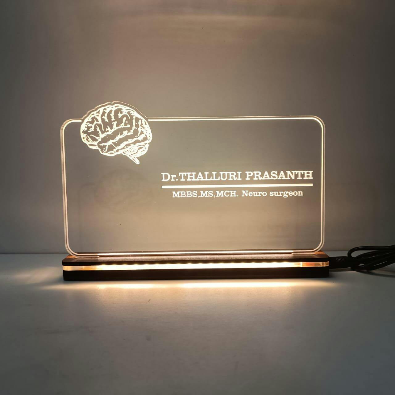 This table top is specially designed for doctors.Thus has an LED light. This consists of Acrylic Plaque, LED Stand, Power Adapter.