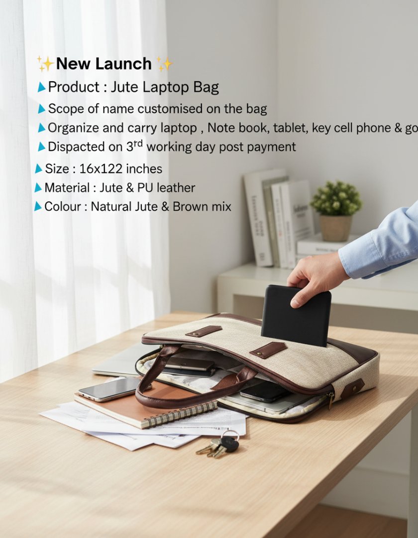 Introducing our brand new Jute Laptop Bag, the perfect blend of eco-conscious design and functional elegance! Crafted with premium natural jute and durable PU leather accents, this bag is designed for modern professionals who value both style and sustainability. Keep your essentials organized and secure while making a statement.