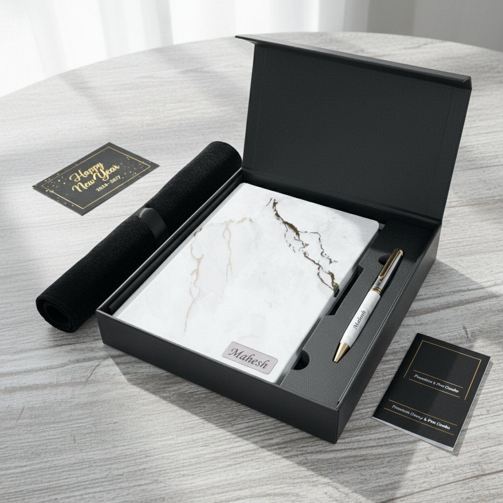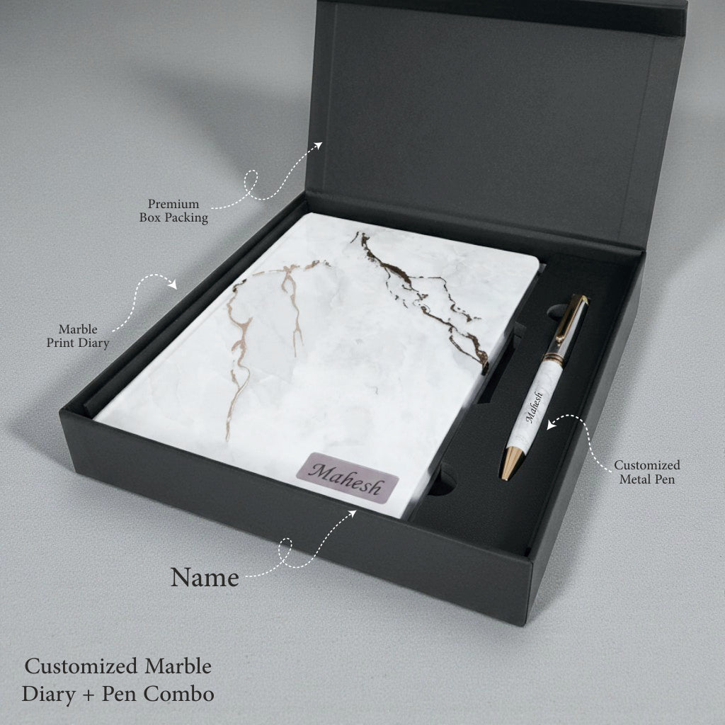 Luxurious Marble Print Diary: A stunning A5 diary featuring a chic, timeless marble design.Personalized Metal Pen: A high-finish metal pen, custom-engraved with any name you desire, adding a truly unique touch.
