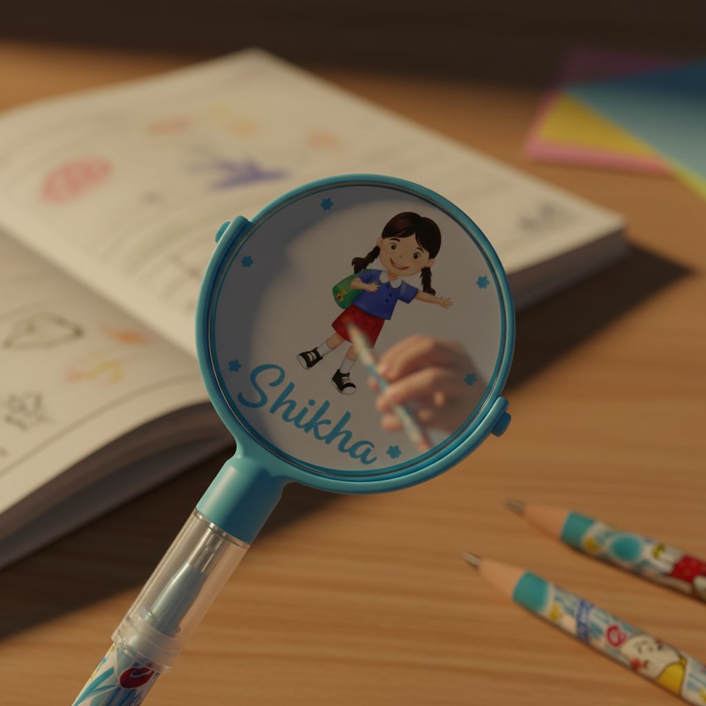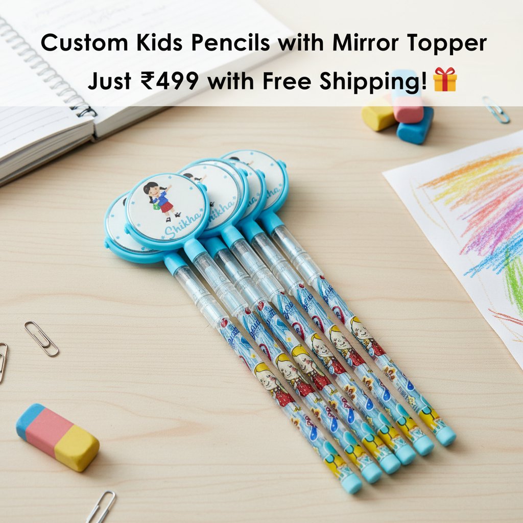 Each pencil features a fun, kid-friendly mirror topper. The image shows a girl character next to the name 'Shikha' on the mirror. Please note the specific character design may vary slightly.