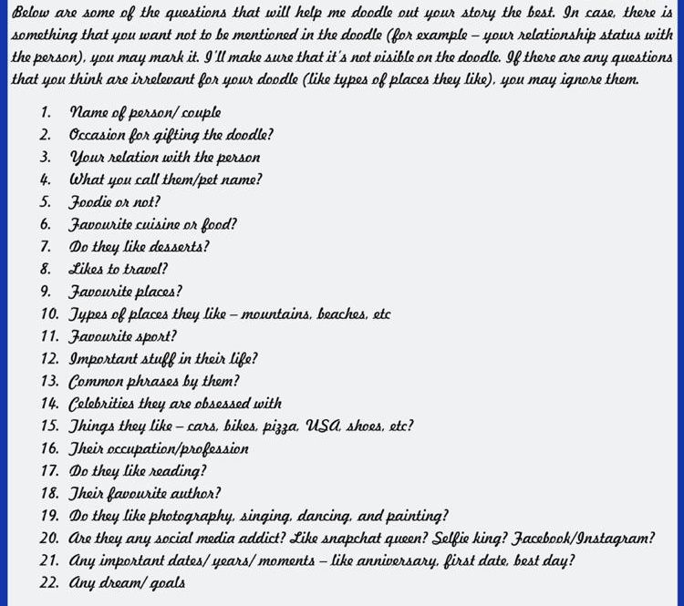A: After placing your order, we will contact you via email or a designated form to collect all the necessary details, including names, dates, photos, and your list of items for doodling.