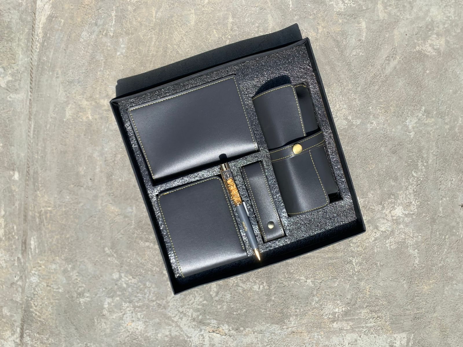 A: The set includes a men's wallet, a passport cover, a keychain, an eyewear case, and a Gold flake pen.