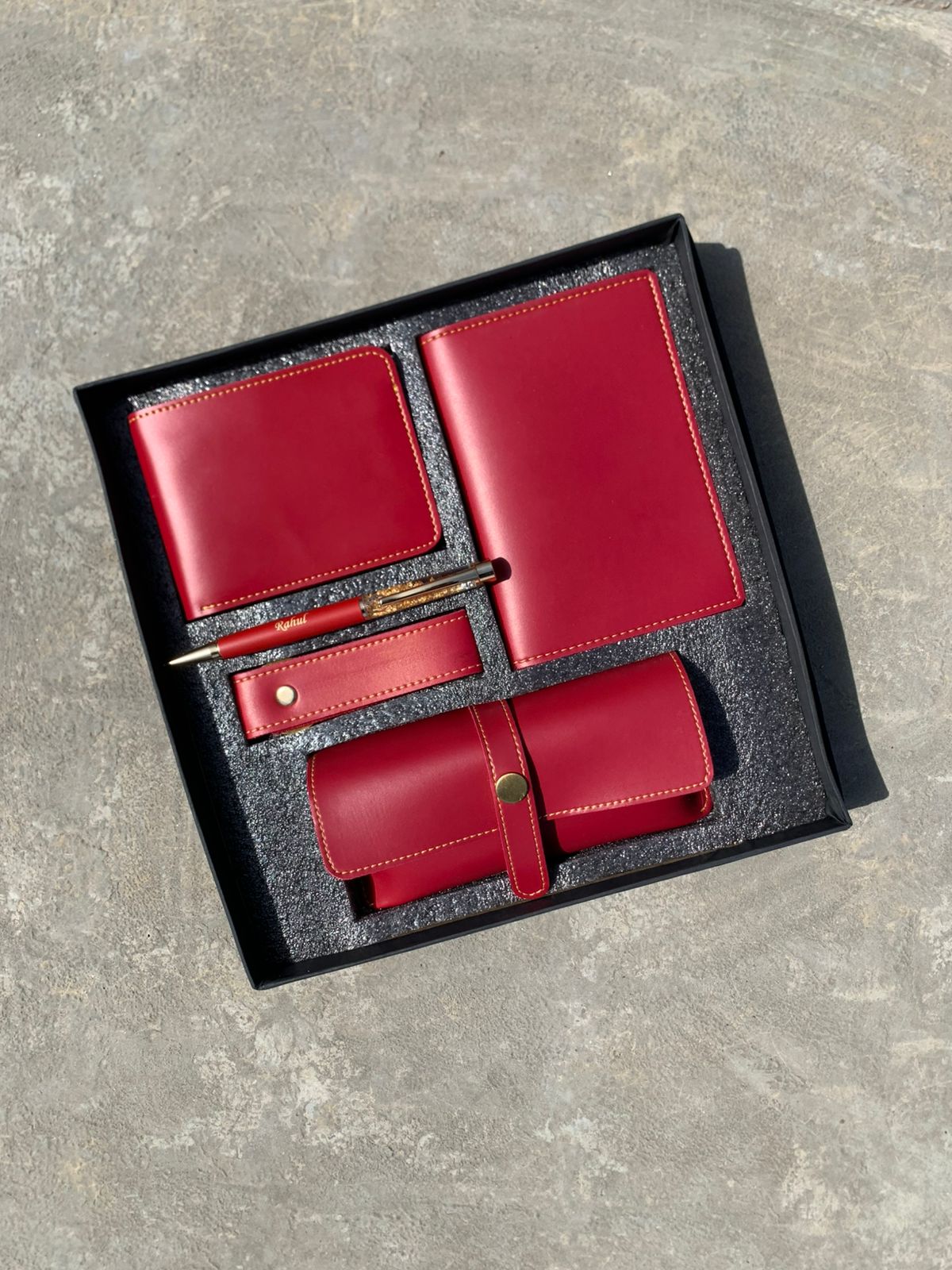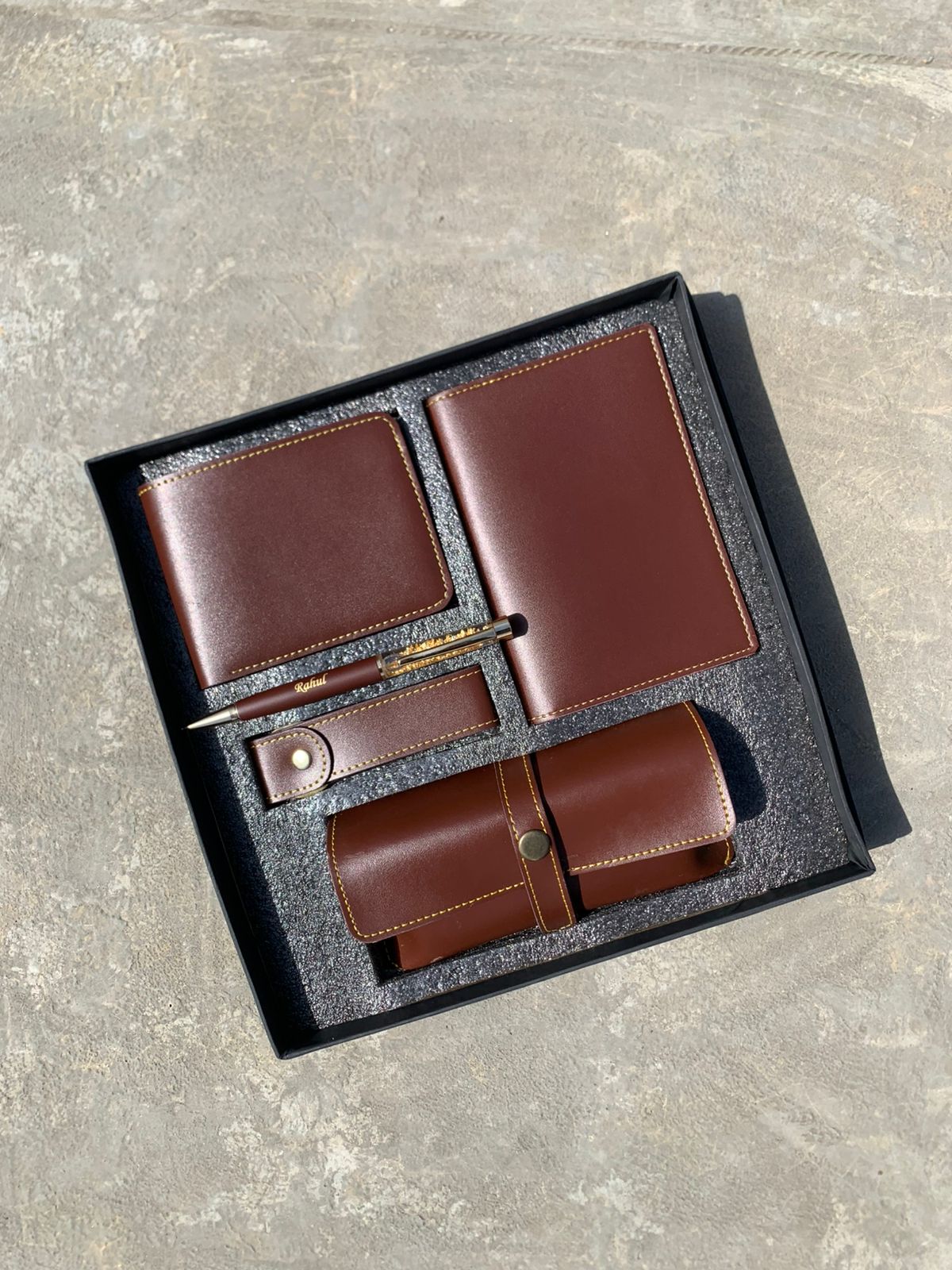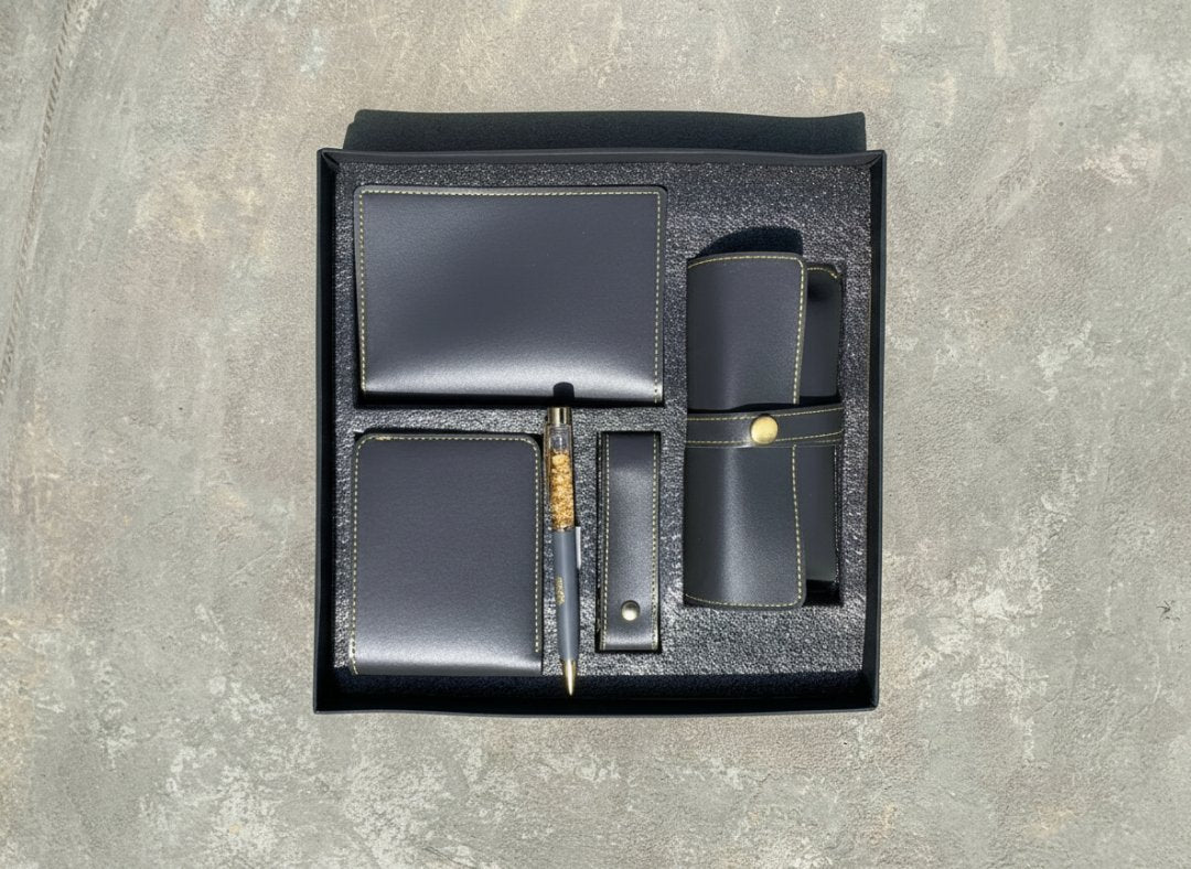 A: Each 5-in-1 Leather Combo Set comes elegantly packaged in a premium box, making it perfect for gifting.