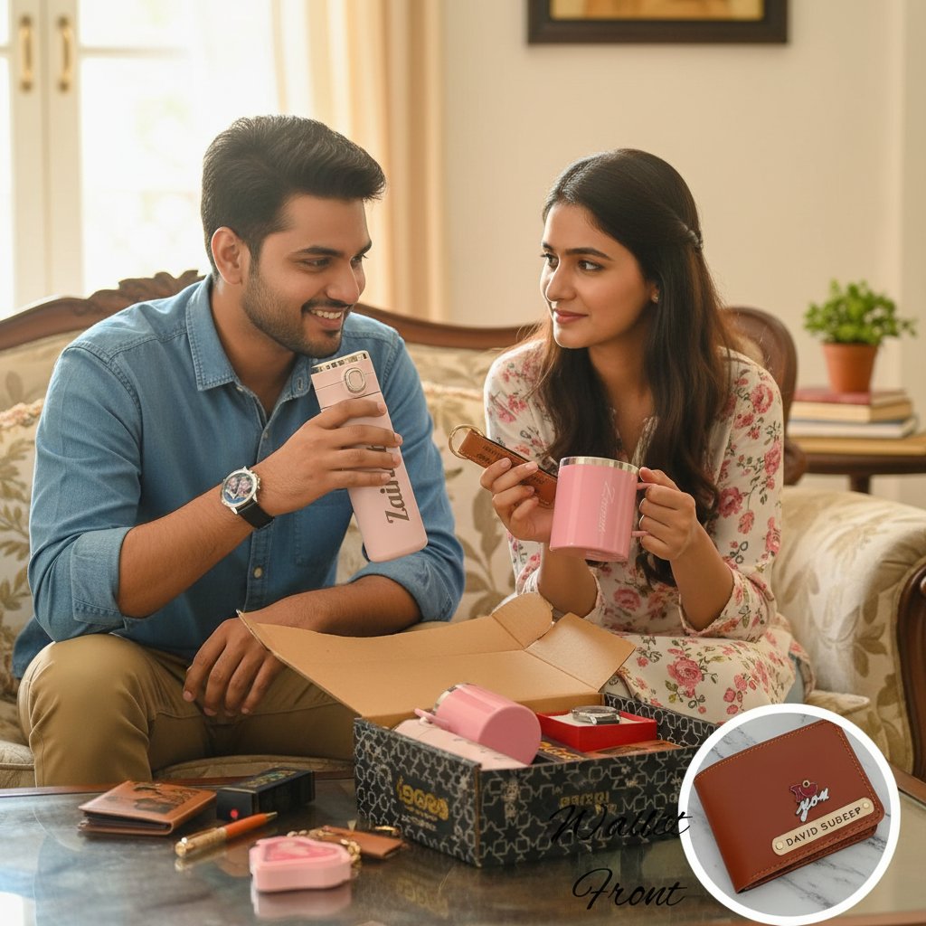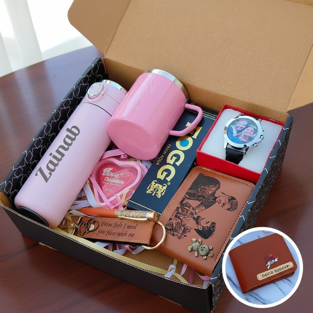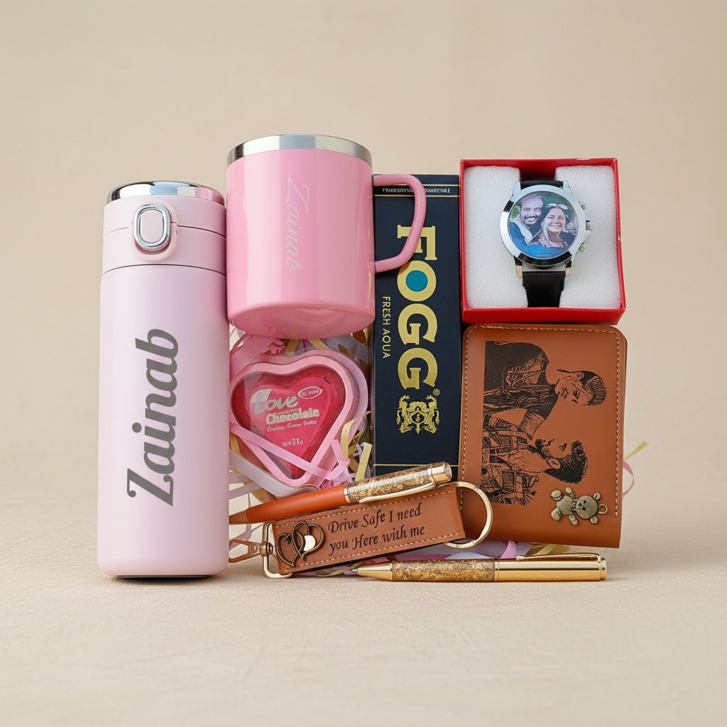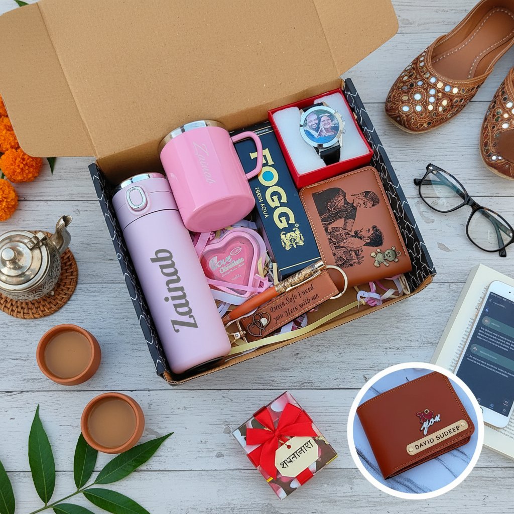 The hamper includes a temperature bottle, a matching color steel mug (250 ml), heart chocolate, an engraved leather key, a gold flake pen, Fogg deo, a customized photo watch, and a dual-side sketch wallet with name, charm, and photo customization.