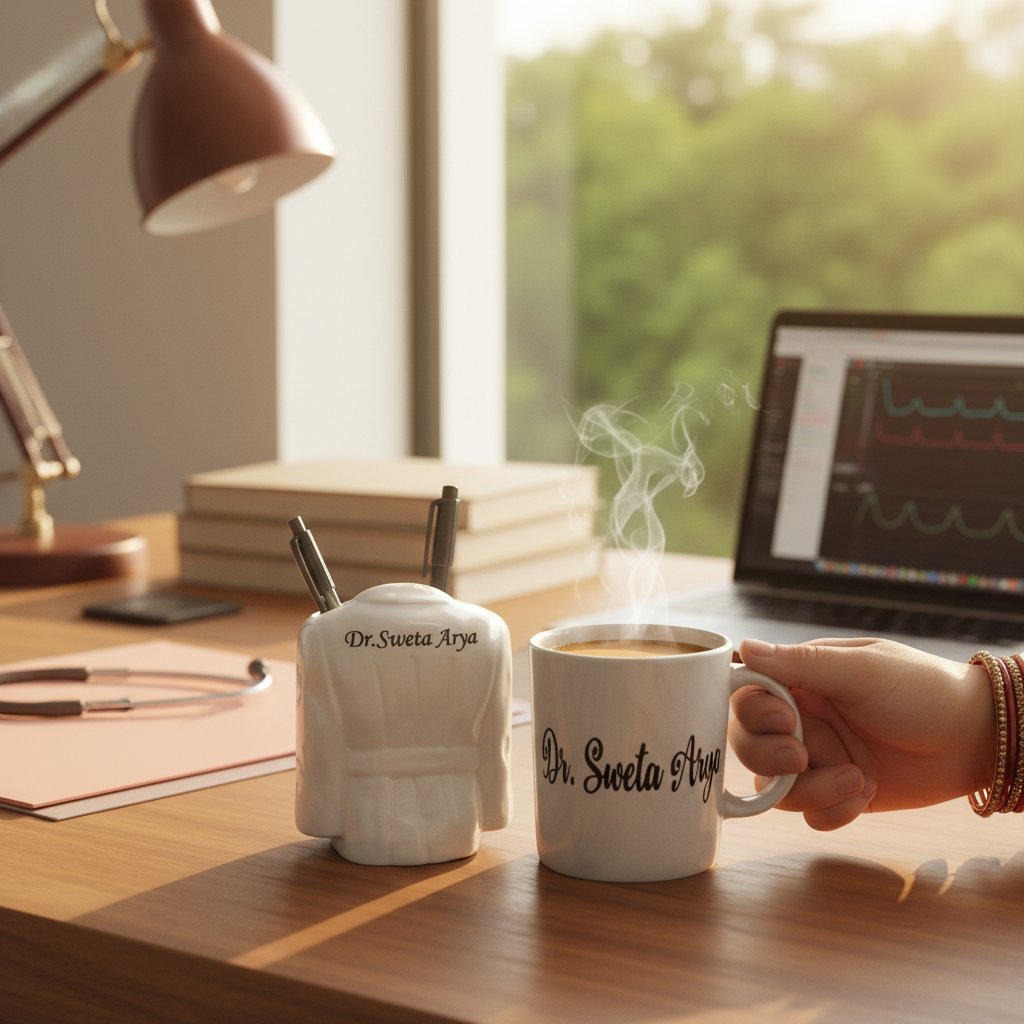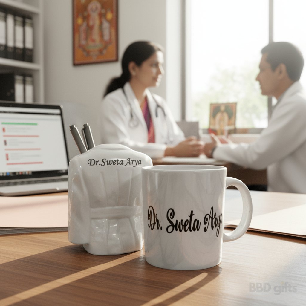 Discover the perfect blend of functionality and personal sentiment with our exclusive Customized Coffee Mug and Pen Stand Set. Designed for professionals, especially doctors, this elegant duo features high-quality materials and can be uniquely personalized with a name, making it an unforgettable addition to any workspace.
