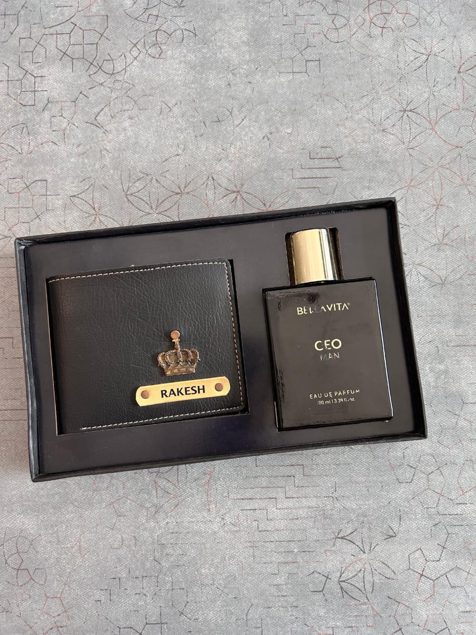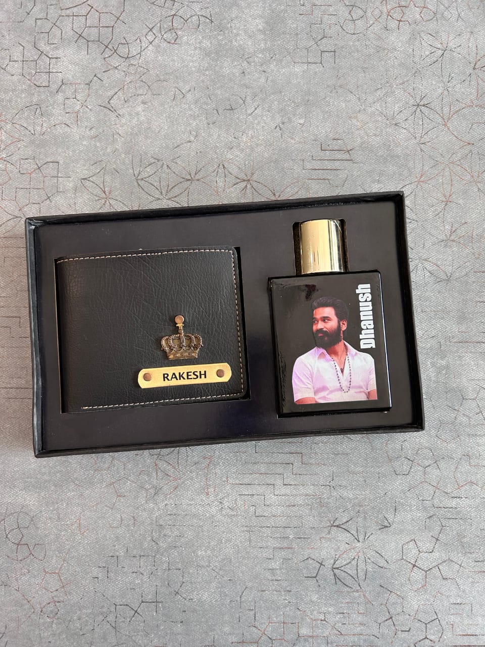 A: You can customize the wallet with a name and the perfume bottle with a photo and a name.