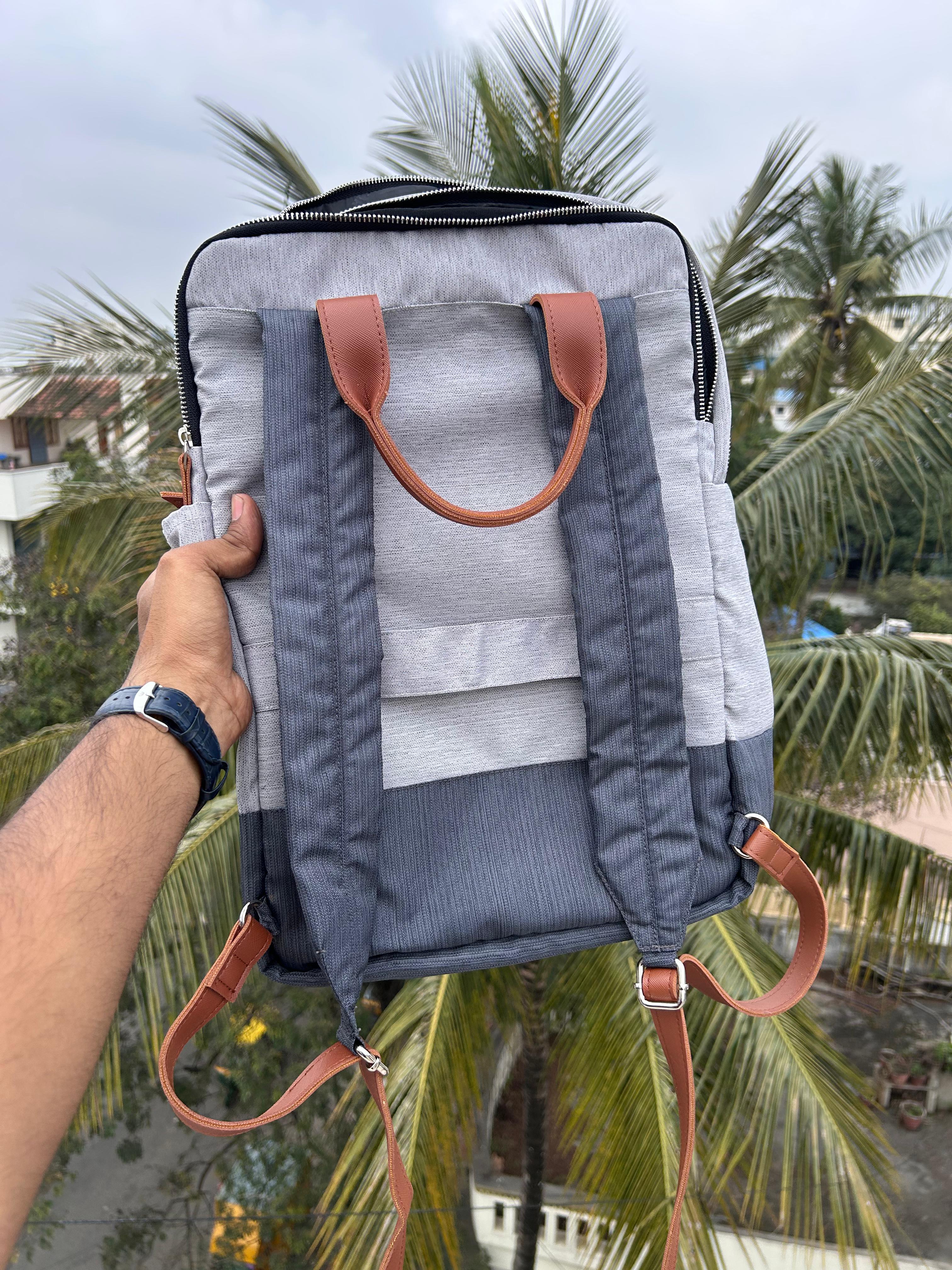A: This specific Deux Classic Laptop Backpack is available in a stylish light grey with a blue bottom, offering a sleek and professional look.