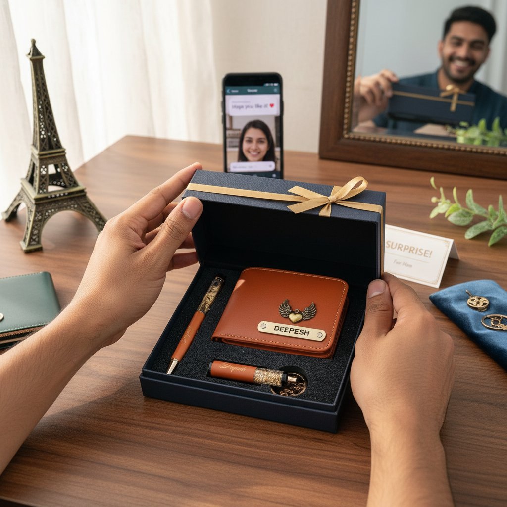 A: Yes, each personalized wallet, pen, and keychain combo comes beautifully presented in an elegant slot box, making it ready to be gifted right out of the package.