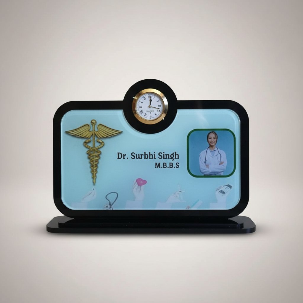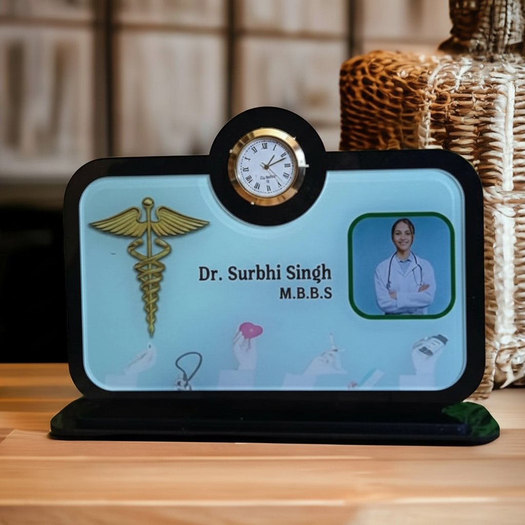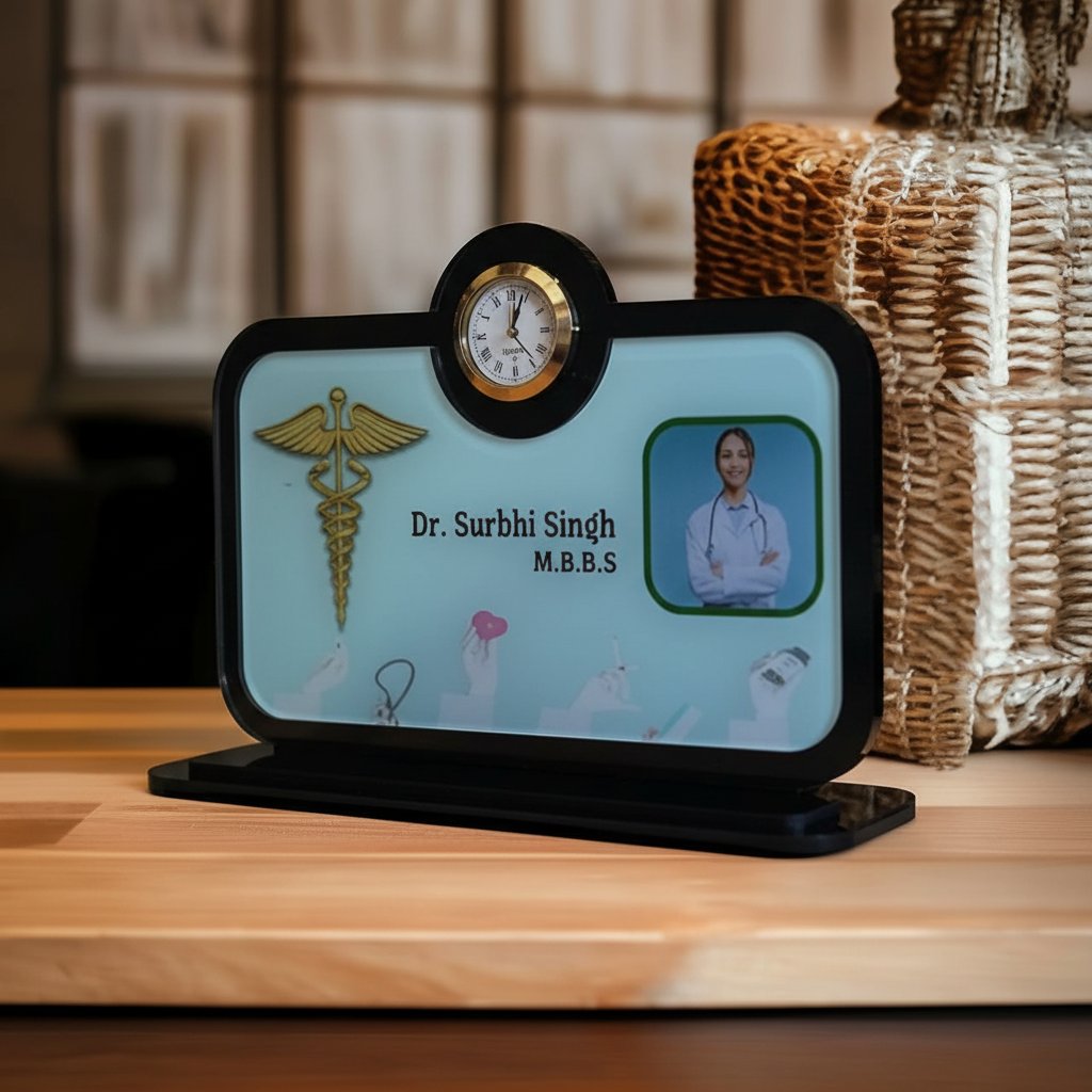 Elevate any doctor's desk or workspace with our exquisite Acrylic Clock Name Plate. Meticulously crafted from double-layered black acrylic, this unique piece combines elegant design with practical functionality. It's not just a name plate; it's a personalized dashboard organizer and a timeless token of appreciation for any medical professional. ✨