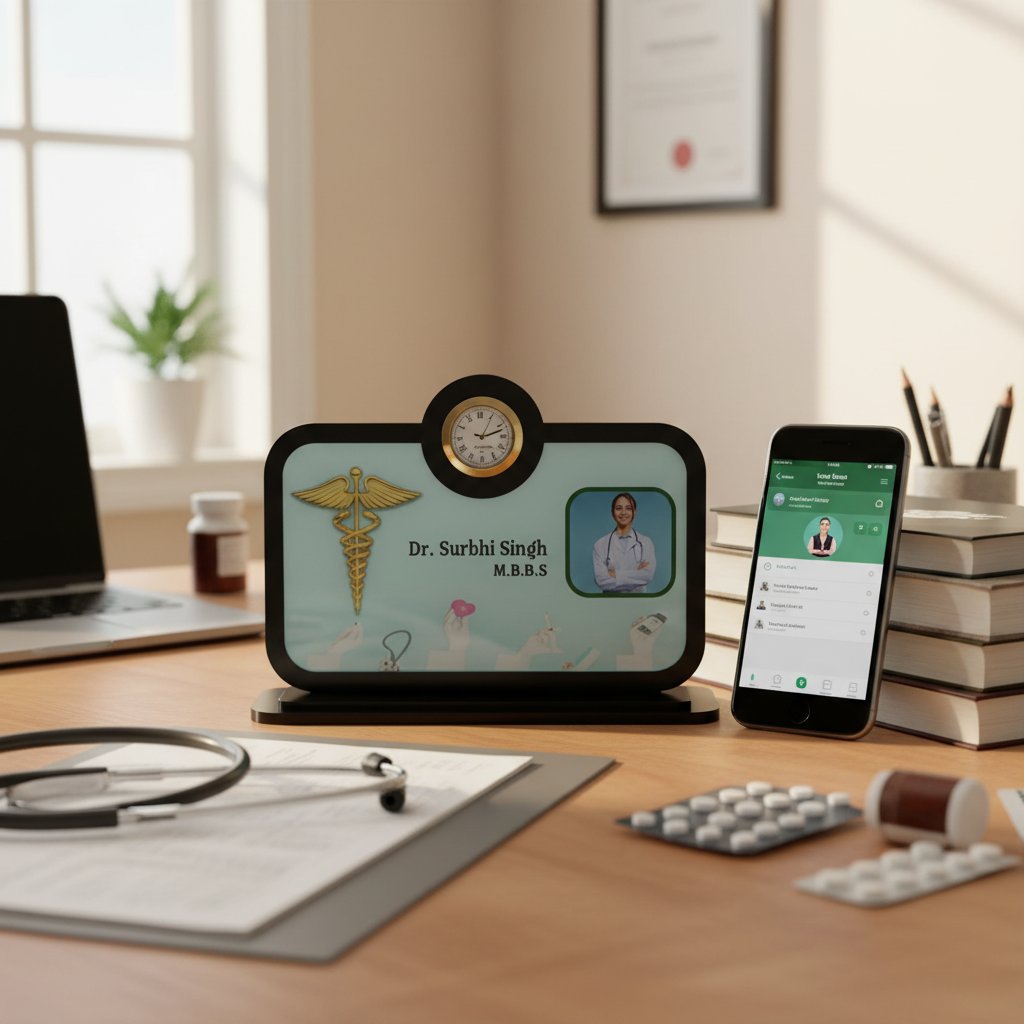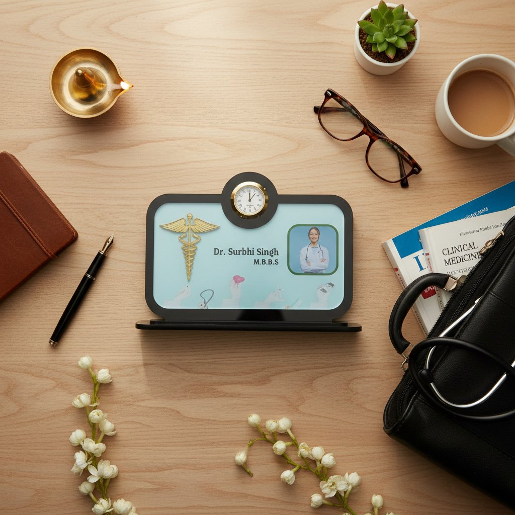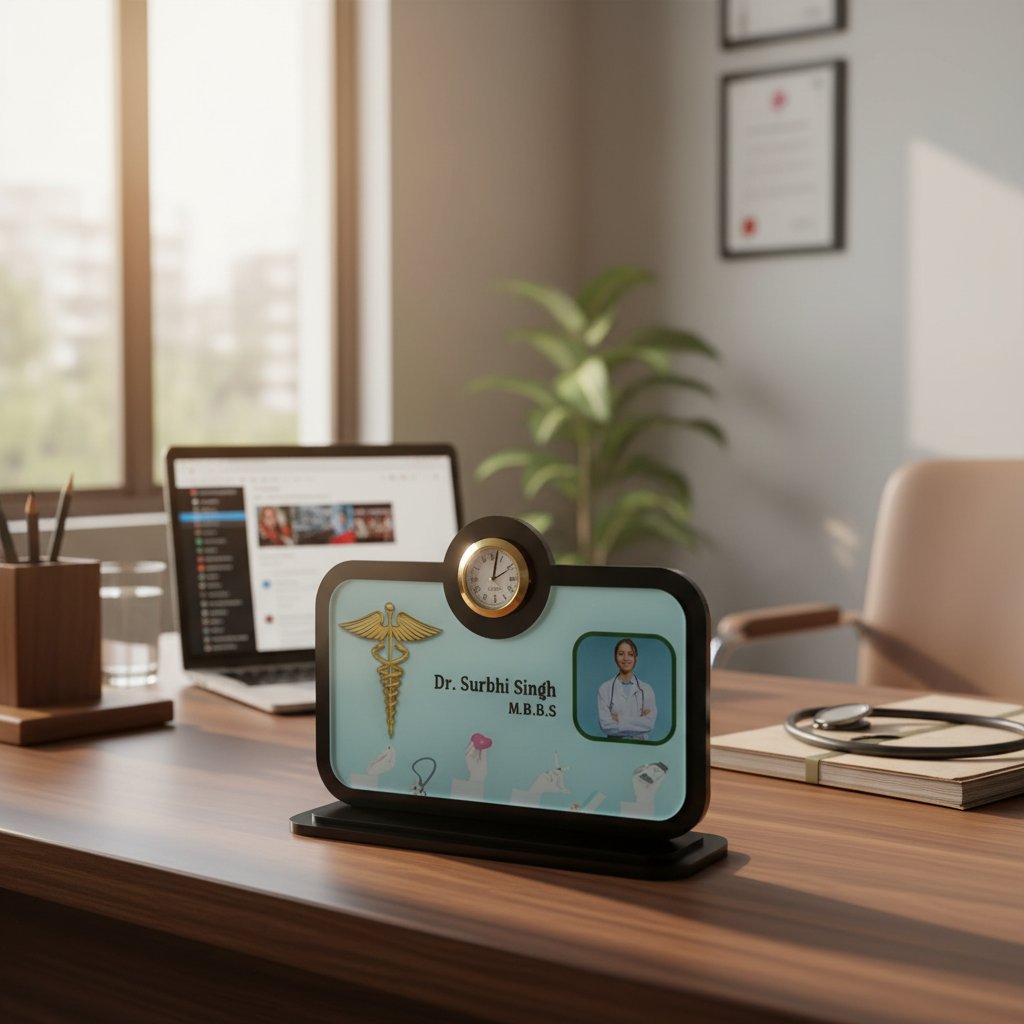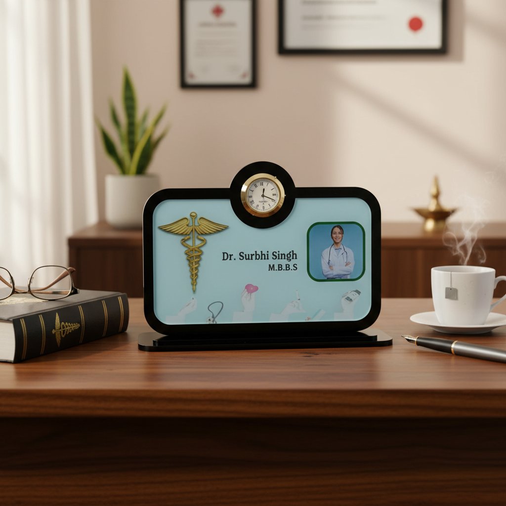 Elevate any doctor's desk or workspace with our exquisite Acrylic Clock Name Plate. Meticulously crafted from double-layered black acrylic, this unique piece combines elegant design with practical functionality. It's not just a name plate; it's a personalized dashboard organizer and a timeless token of appreciation for any medical professional. ✨
