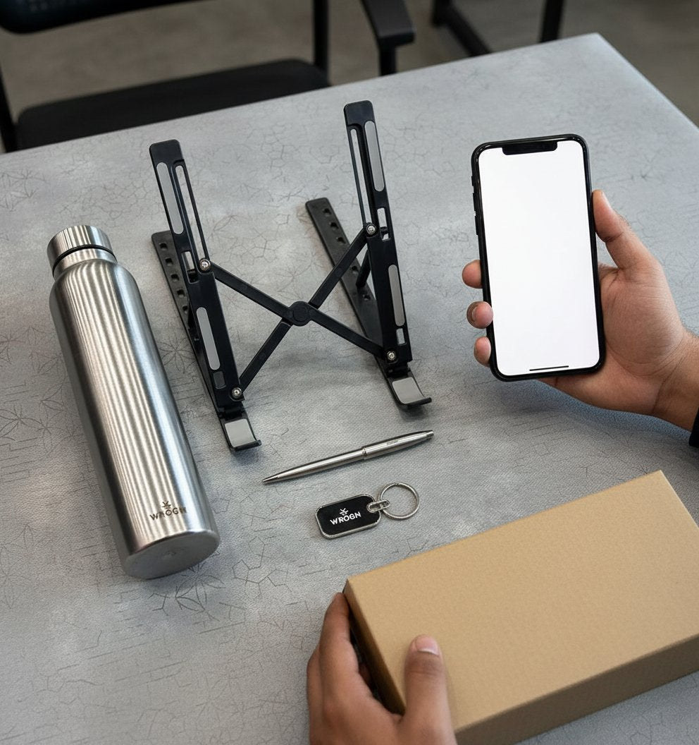 A: You can customize the Classic Steel Bottle, Steel Cross Pen, and Steel Keychain with a name or logo. The laptop stand is not customizable.