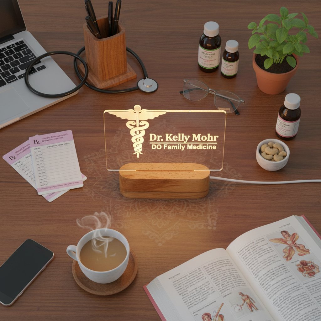 A: You can personalize the lamp with a doctor's name, their specialization (e.g., "DO Family Medicine"), or a custom message. The medical symbol (Caduceus) is a standard design.