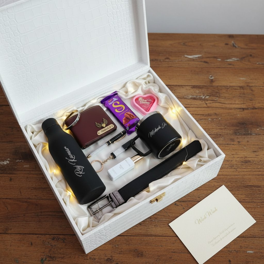 A: The hamper includes a Hot & Cold Flask (750 ml), Stainless Steel Mug (250 ML), Nexon Wallet, Baleno pen & Keychain, Metal Kada, Customised Leather Belt, Bellavita Perfume (random color), Silk Chocolate, Heart Chocolate, an optional Wish Card, and an LED Light Box.