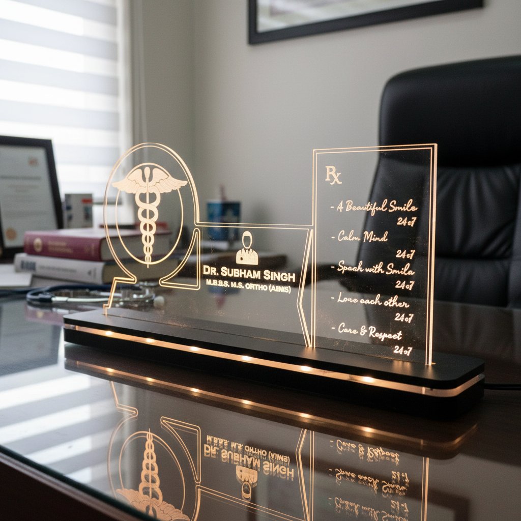 I recently ordered this custom acrylic nameplate for my clinic, and I’m extremely satisfied with the quality and design. The engraving is neat and clear, the medical symbol adds a professional touch, and the acrylic feels durable. It looks elegant on my desk and has impressed quite a few of my patients and colleagues. Highly recommended for any healthcare professional looking for a personalized touch!