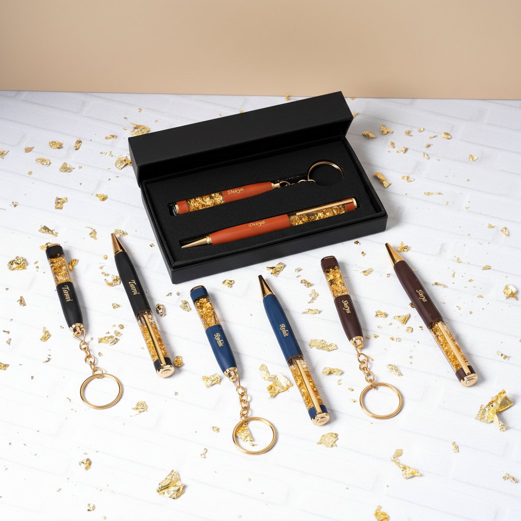 **Real Gold Flake Design:** Each pen and keychain boasts captivating gold flakes, creating a dazzling and unique aesthetic.✍️