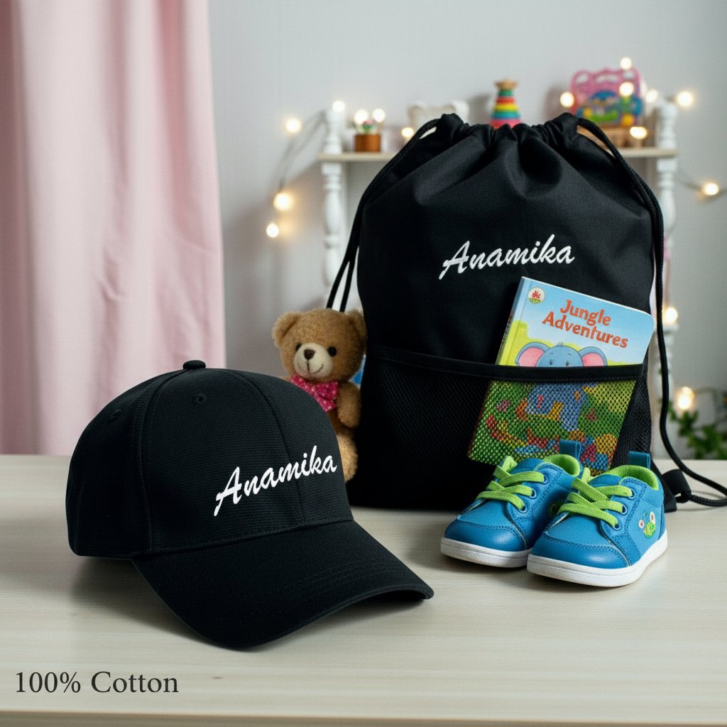 Give your child a hat that's as unique as they are! Our Customised Unisex Black Cap for Kids is in high demand, allowing you to add any name for a truly special touch. Crafted from 100% premium cotton, this cap offers ultimate comfort and style for every adventure, making it the perfect accessory for school, play, or any sunny day out.
