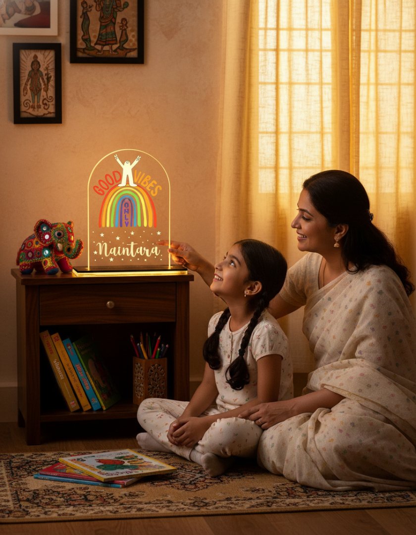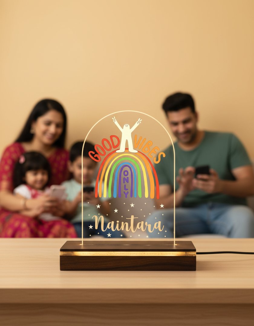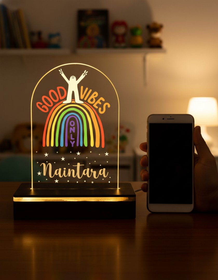 Illuminate your child's space with a touch of magic and positive energy! Our enchanting LED Table Top Lamp, featuring a vibrant 'Good Vibes Only' rainbow design and personalized with their name, creates a warm and inviting ambiance in any room. It's not just a lamp; it's a glowing statement of happiness and individuality, perfect for bedtime stories or simply adding a cheerful glow.