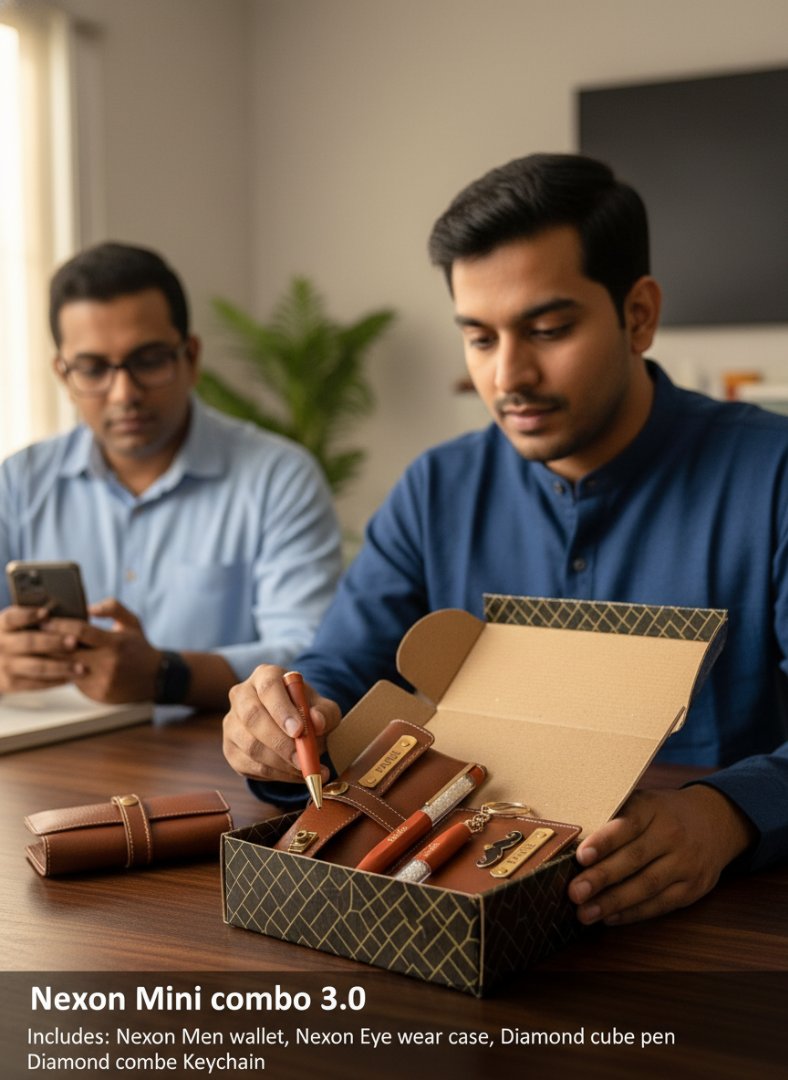 Surprise the special man in your life with our exclusive Nexon Mini Combo 3.0 – a sophisticated and practical gift set designed for style and utility. This premium collection includes four essential items, all elegantly presented and ready to be personalized just for him. Perfect for any occasion, it's a thoughtful way to show you care.