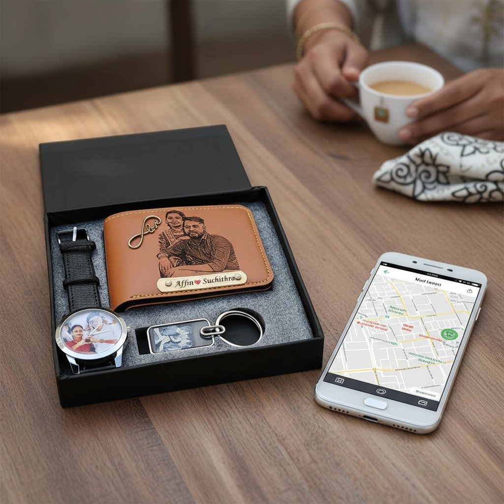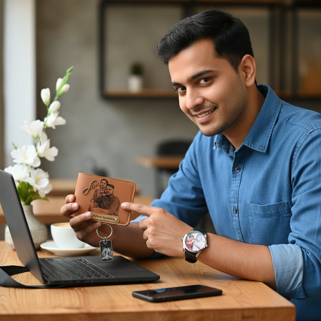 Elevate his style and celebrate your cherished moments with our Essential Mini Combo for Men. This exquisitely curated set features three indispensable accessories, each meticulously customized with your favorite photos and text, making it a truly unforgettable gift. Perfect for birthdays, anniversaries, Father's Day, or just because!