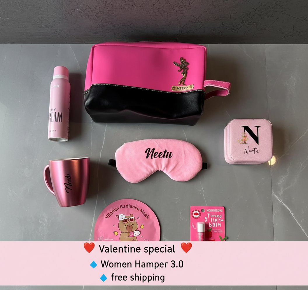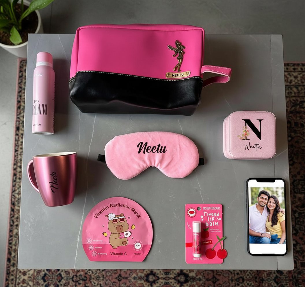 Answer: The hamper includes a customized Utility Pouch, Eye Mask, Jewellery Box, and Bistro Mug, along with a Zudio Deo, Miniso Lip Balm, and Miniso Face Mask.