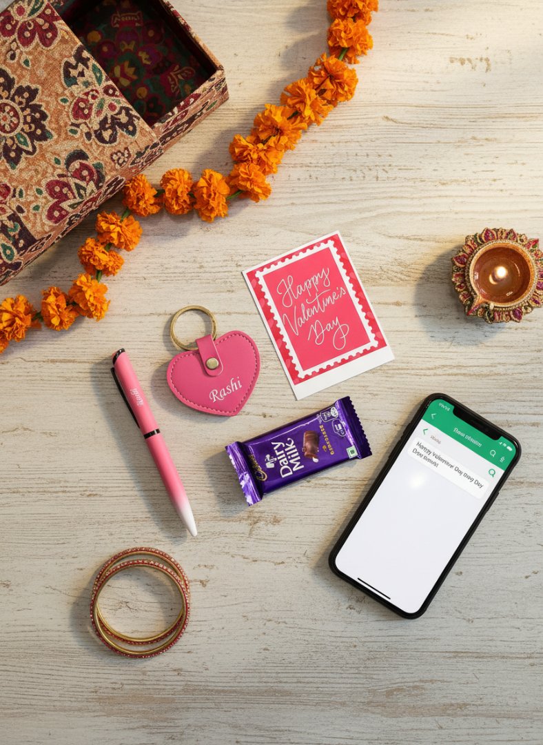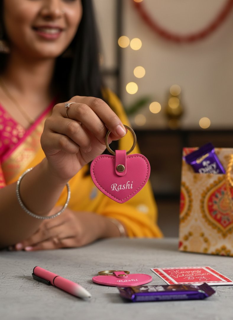 Ā The Valentine Combo 1.0 is a delightful package that includes one personalized Nexon Pen, one heart-shaped keychain (also personalized), a delicious Dairy Milk chocolate bar, and a special Valentine's Day card.