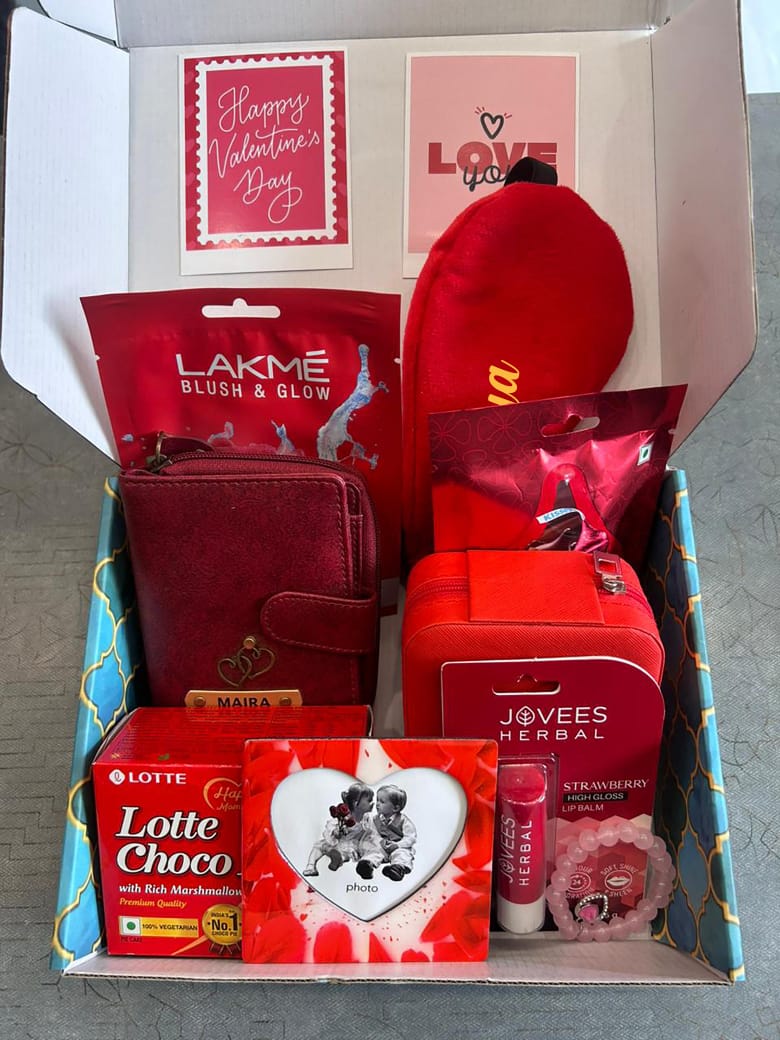 This isn't just a gift; it's an experience tailored for her! The personalization on the wallet, eye mask, and jewellery box adds a unique, heartfelt touch that shows how much you care. Itβs a versatile collection of practical items, pampering essentials, and delightful treats, all elegantly presented. Imagine her joy as she discovers each customized item and savors the sweet surprises. It's an unforgettable way to say 'I Love You' this Valentine's Day or for any special occasion!