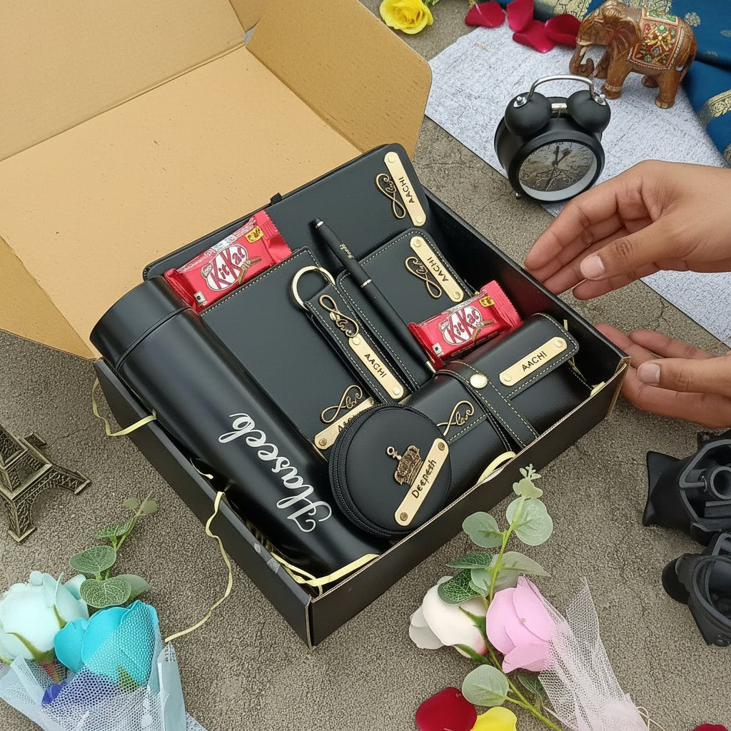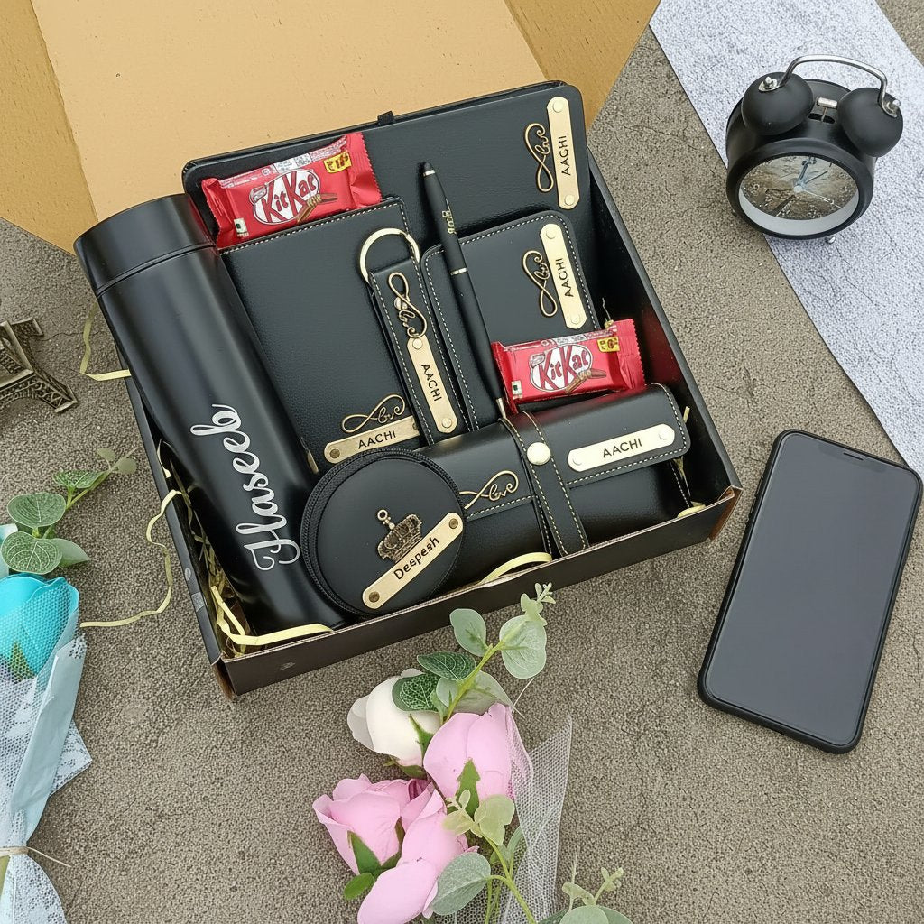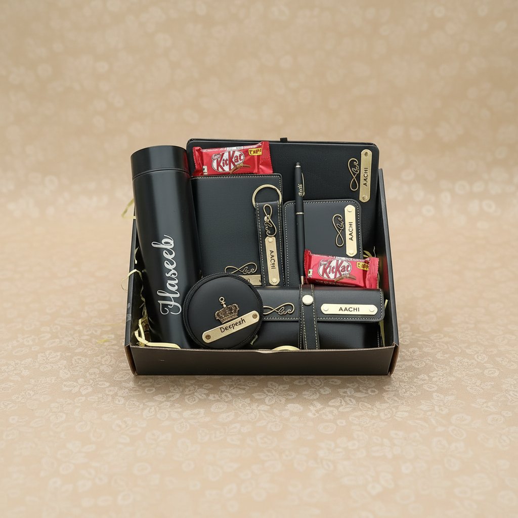 Treat someone special to an unforgettable gift with our Premium 9-in-1 Men's Wallet Hamper. This all-black, sophisticated combo includes everything a man needs for a stylish and functional day-to-day experience. Each item can be personalized with his name or a special message, making it a truly unique and thoughtful present for birthdays, anniversaries, Valentine's Day, or any special occasion. Elegantly packed in a premium box, this hamper is designed to impress!